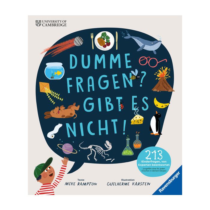 In diesem illustrierten Kindersachbuch beantwortet der Autor Mike Rampton 213 echte Kinderfragen – mindestens eine für jeden Knochen im menschlichen Körper – auf leicht verständliche, zuverlässige und humorvolle Art und Weise. Dabei geht es um Tiere, Pflanzen, Weltall, Kunst, Farben, Physik, Mathe, Dinos, Geschichte, Körper, Fahrzeuge und vieles mehr. Expertinnen und Experten der Universität Cambridge haben alle Antworten auf ihre Richtigkeit geprüft. Die witzigen Illustrationen von Guilherme Karsten machen dieses Wissensbuch zu einem echten Leseerlebnis für Groß und Klein. Die Botschaft lautet: Dumme Fragen gibt es nicht, denn nur wer fragt, gewinnt. In diesem Sinne möchte das Buch die Neugier in den Lesern wecken und sie dazu ermuntern, ihre Welt fragend zu erkunden.