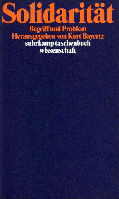 Bayertz, Kurt: Begriff und Problem der Solidarität. Steinvorth, Ulrich: Kann Solidarität erzwingbar sein?. Capaldi, Nicholas: Was stimmt nicht mit der Solidarität?. Khushf, Georges: Solidarität als moralischer und politischer Begriff. Munoz-Dardé, Véronique: Brüderlichkeit und Gerechtigkeit. Metz, Karl H.: Solidarität und Geschichte. Institutionen und sozialer Begriff der Solidarität in Westeuropa imm 19. Jahrhundert. Tenfelde, Klaus: Arbeiterschaft, Solidarität und Arbeiterbewegung. Kommentar zum Beitrag von Karl H. Metz. Wildt, Andreas: Solidarität-Begriffsgeschcihte und Definition heute. Thome, Helmut: Soziologie und Solidarität:Theoretische Perspektiven für eine empirische Forschung. Bierhoff, Hans W.: _. Küpper, Beate: Sozialpsychologie der Solidarität. Voland, Eckart: Die Natur der Solidarität. Denninger, Erhard: Verfassungsrecht und Solidarität. Baurmann, Michael: Solidarität als soziale Norm und als Norm der Verfassung. Lukes, Steven: Solidarität und Bürgerrecht. Preuß, Ulrich K.: Nationale, supranationale und internationale Solidarität. Kersting, Wolfgang: Internationale Solidarität. Engelhardt, H. Tristram jr.: Solidarität:postmoderne Perspektiven. Wildes, Kevin Wm.: das postmoderne Dilemma. Göbel, Andreas: _. Pankoke, Eckart: Grenzen der Solidarität. Solidaritätsformeln und Solidaritätsformen im Wandel. Arndt, Ulrike: Solidarität. Eine Auswahlbibliographie